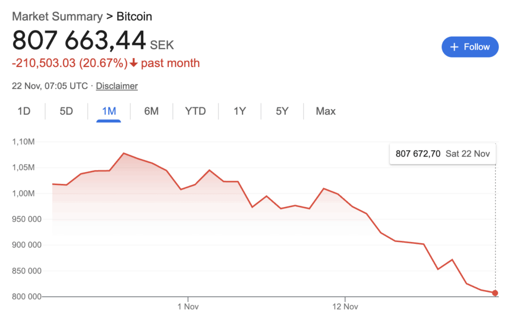 Den som köpte den första januari, betalade motsvarande 1 031 000 kronor per bitcoin. Om man säljer i dag får man ut 805 000 kronor. En förlust på omkring 20 procent.