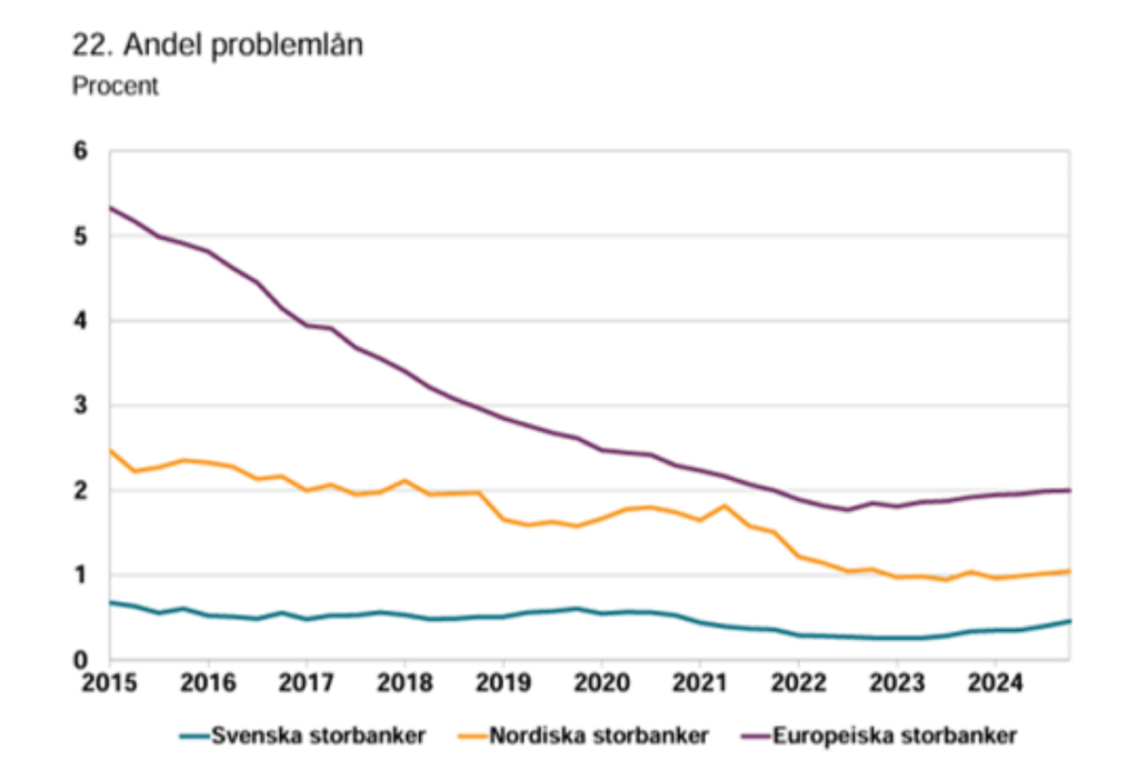 Storbankernas problemlån som andel av total utlåning ökade visserligen något under andra halvåret 2024 och låg på 0,5 procent den sista december i fjol.