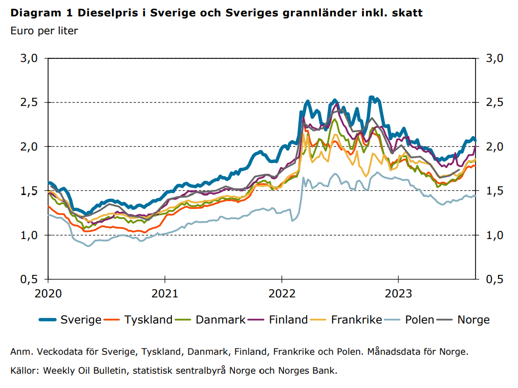 ”Även Frankrike har lägre dieselpris än Sverige under perioden 2020–2023, trots att de haft något högre skatter både som andel och i nivå jämfört med Sverige”, konstaterar den statliga myndigheten.