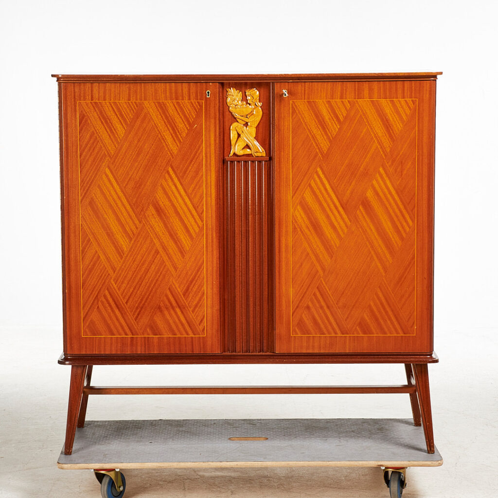 Här finns prylar från företagets tidiga år, som till exempel skåpet Oxford med en touch av bildhuggeri. På 1960-talet kom den danska designen in i sortimentet där två Florens-fåtöljer, formgivna av centralgestalten Erik Wørts, finns på auktionen.