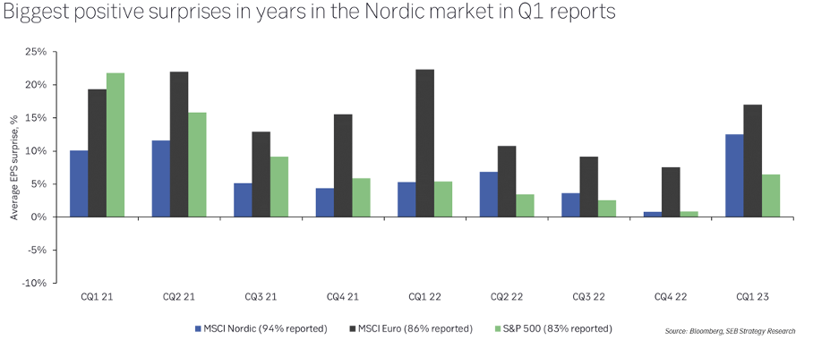 Farhågan om svaga börsrapporter kom på skam. Första kvartalets utfall blev väsentligt starkare än befarat. Såväl i Norden som i Europa och USA.