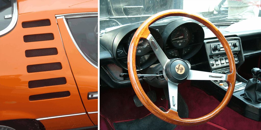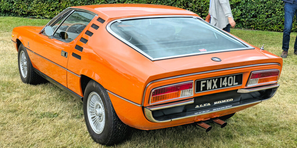 Alfa Romeo Montreal har proportioner som är kompakta men kraftfulla, med detaljer som är både lekfulla och disciplinerade. Det märks att Bertone är i full blom här.