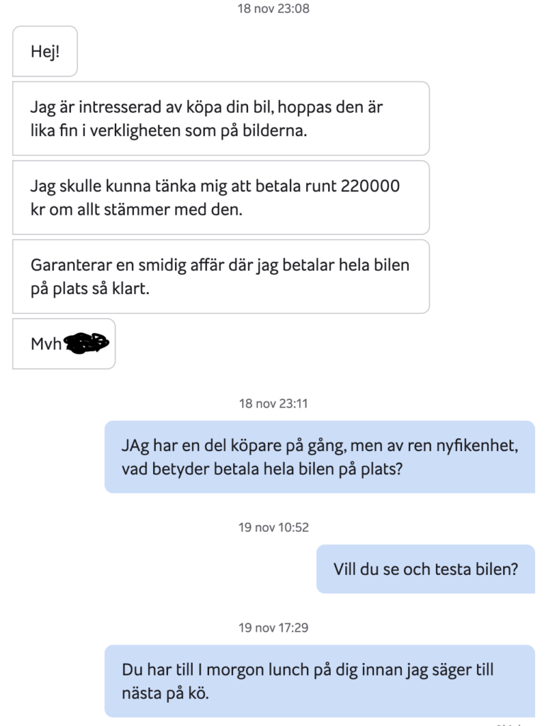 Och Z, som hanterade SMS som om han hade ett ackord på antal utskick. Han lovade betalning “på plats”, vad nu det betyder, och försvann spårlöst när jag föreslog att han kunde titta på bilen. Klassisk Blocketdynamik: höga bud, låg närvaro.
