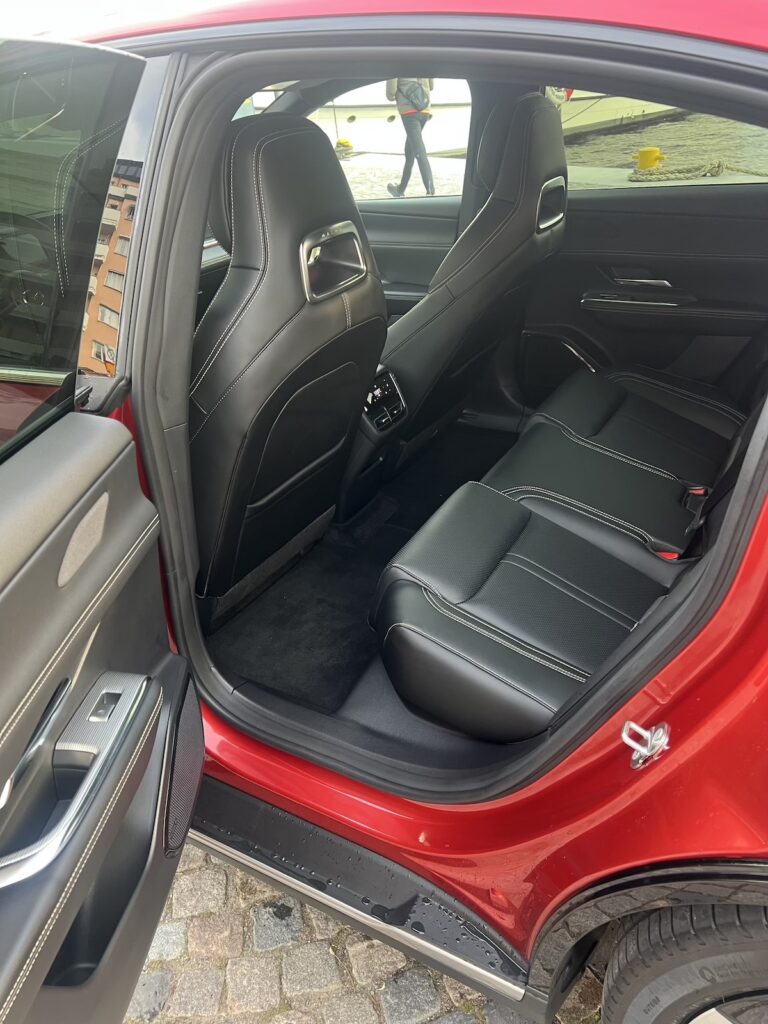 I baksätet finns bra knäutrymme för klassen och helt okej huvudutrymme. Däremot gör batterigolvet att fötterna hamnar högt. Benvinkeln blir märkbart sämre för vuxna på längre resor.