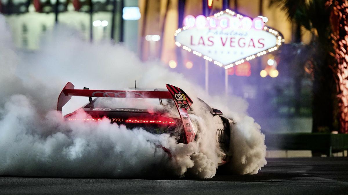 Han rattar prototyp-elbilen Audi S1 Hoonitron i skyhög fart på the Strip, sladdar runt Eiffeltornet, genom ett hotell och hoppar till sist ut från ett parkeringsgarage.