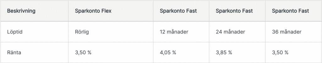 - Sparkonto plus: På detta konto får du tillgång till en högre sparränta. Dock får du endast fyra fria uttag per år och måste spara minst 100 000 kronor.