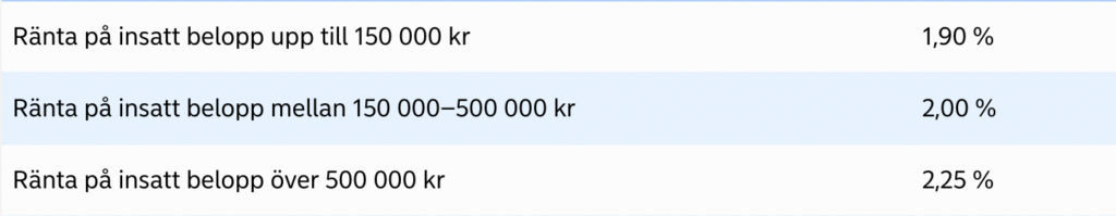 Vad gäller fasträntekontot kan du binda kapitalet på 3–36 månader. Här krävs en insättning om minst 10 000 kr. Du kan ta ut pengarna i förtid, men behöver då betala en avgift om 2,5% av uttaget belopp.