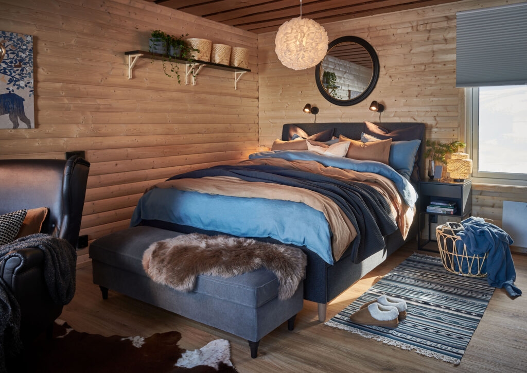 “Målet var att skapa en juniorsvit i stugformat som är den perfekta vildmarksdestinationen för två personer med fokus på avslappning, mysighet, avskildhet och närhet till naturen”, berättar företagsinredaren Hanna Wallo på IKEA.
