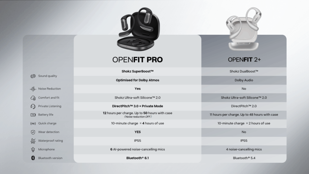 OpenFit Pro ska ge upp till 12 timmar speltid på en laddning, och totalt upp till 50 timmar med det medföljande fodralet. En snabb 10-minuters laddning ger cirka fyra timmars användning och hörlurarna stöder trådlös laddning.