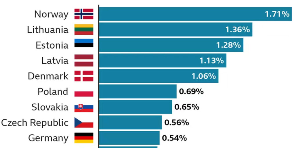 Sveriges grannland har lagt den största delen av sin BNP på kriget, 1,71 procent, att jämföra med till exempel Sverige som har lagt 0,41 procent av BNP:n på kriget. USA som givetvis har en helt annan BNP än Norden, hart lagt 0,33 procent på Ukraina.