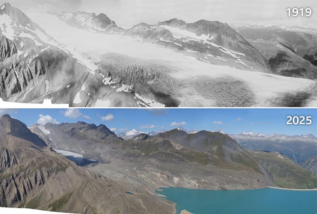 Att världens glaciärer snabbt smälter är ingen nyhet men ibland blir det extra tydligt när utvecklingen visas genom bildbevis. I Schweiz har många glaciärer försvunnit nästan helt.