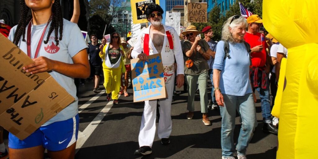 Miljoner amerikaner samlades i helgen för att demonstrera mot det de beskriver som Trumps försök att göra en amerikansk kung av sig själv. (Foto: Yalonda M James/AP-TT)