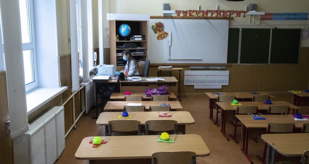 Ryska klassrum, som tidigare fylldes av matteböcker och sånger om moderslandet fylls nu av kamouflageuniformer, militärinstruktörer och vapen.