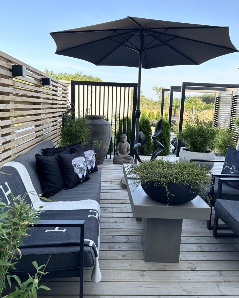 För att få till en mysig känsla behöver du rama in din uteplats. Det kan du göra med spaljéer, skärmväggar, staket eller gardiner. Men även en matta på golvet ramar in olika funktioner och gör att uterummet känns mer som ett vanligt rum inne.