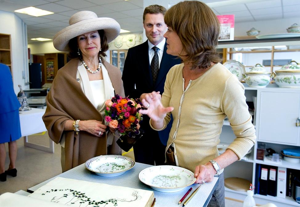 Dekoratören Karen Thomasen (t.h.) visar upp porslin från Royal Copenhagen för Drottning Silvia (t.v.) I mitten står Royal Copenhagens vd Peter Lund. (Foto: TT)