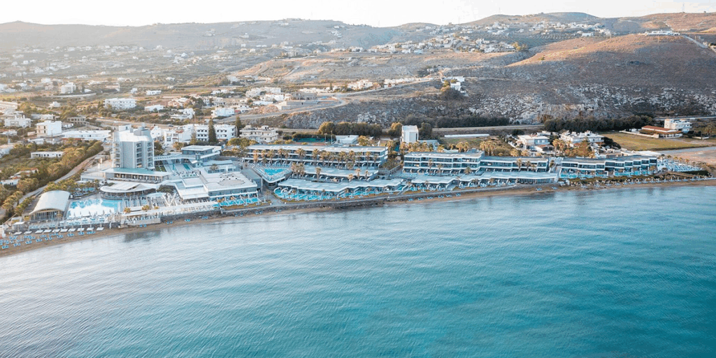 Rationell grekisk familjelogik: Privat strand, vattenpark som gjord för lek och generösa ytor för familjen. Kulmen av friktionfri semesterdelning med plats för alla behov. Det tydliga zon-tänket gör att barnens aktivitet inte stör de vuxnas återhämtning.