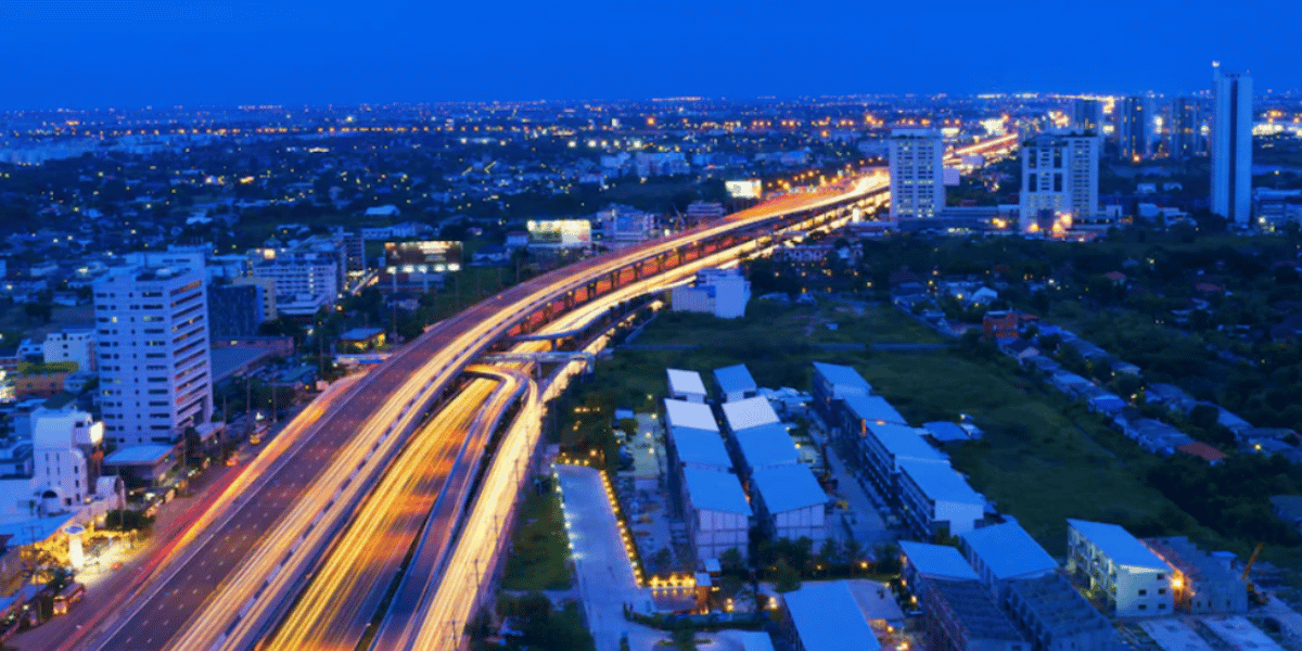 Den längsta körbara bron på jorden: drygt 54 kilometer över Bangkoks trafikmyller. Byggd på tre och ett halvt år, för en miljard dollar, med 1,8 miljoner kubikmeter betong. Den svävar som en betongmotorväg ovanpå en annan väg – funktion och form smälter samman och skapar en ny typ av stadssiluett.