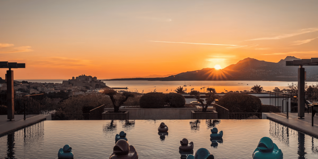 Lyx med lugn. Småskaligt, med cirka 20 rum och två sviter, infinity-pool och ett spa med bastu, hamam, banya och uppvärmd inomhuspool – alla med utsikt över maquis eller citadellet. Genuin känsla, fri från turistflaner.