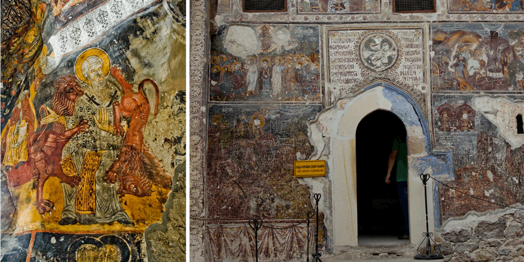 I flera fresker har ögonen skrapats bort. Guiden Öznur Doksöz säger att en förklaring är att lokalbefolkningen kokade färgflagor i vatten och drack det som välsignelse.