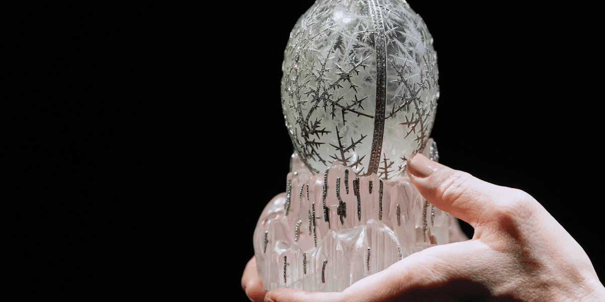 Vinterägget skapades 1913 åt tsar Nikolaj II som gåva till hans mor, Maria Fjodorovna. Formgivaren Alma Pihl hämtade idén från isflingor på ett fönster i ateljén – och resultatet är något som ser ut som ett fruset universum: bergkristall, platina, 4500 diamanter och en liten blomsterkorg i kvarts och granat.