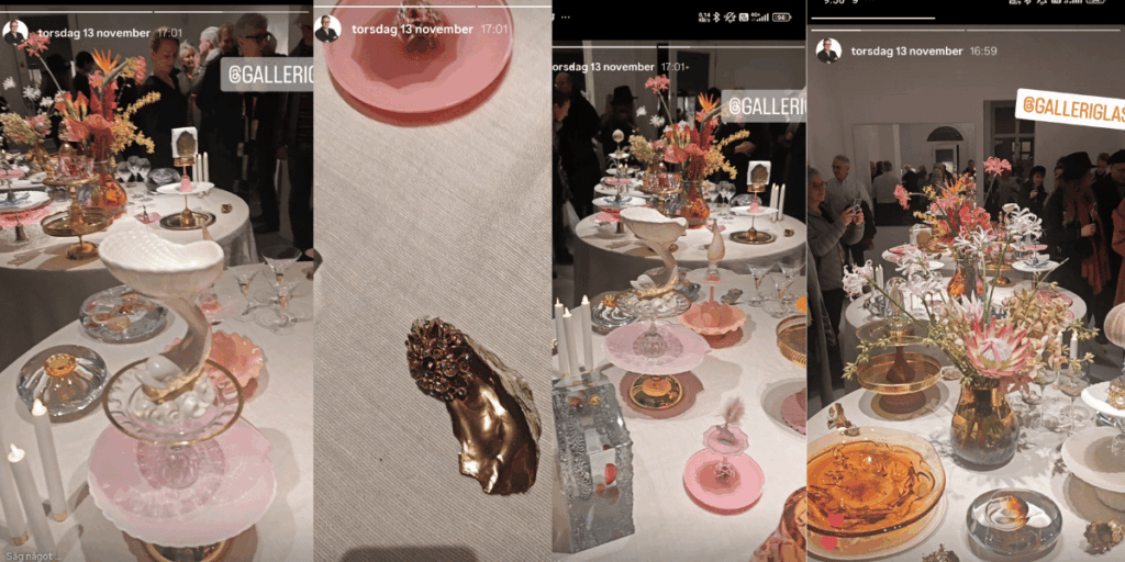Inleder följaktligen kvällen med att besöka Galleri Glas vars två konstnärer jag intervjuat tidigare i veckan. Charlotte Birnbaum och Erika Lagerbielke har skapat en maffig utställning med grejer i glas och porslin som man kan ställa på matbordet för att liva upp måltiden.